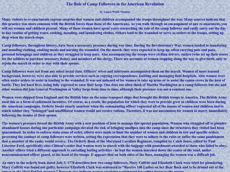 This article, written for re-enactment newsletters, tells of women as camp followers in the American Revolution. There is an extensive bibliography included.