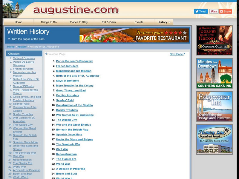 A detailed text of the history of St. Augustine, Florida. The menu bar to the left acts as an interactive graphic timeline allowing each main event to be viewed. An excellent source for detailed research.