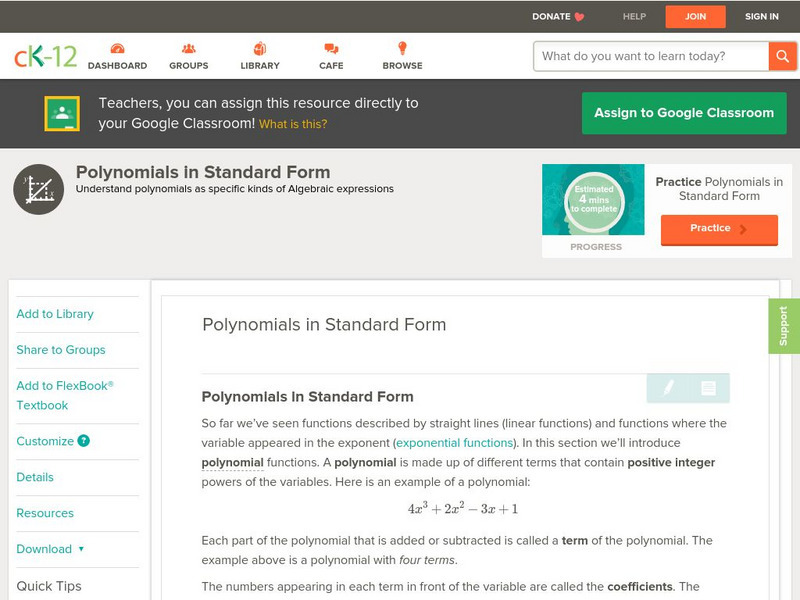 [Free Registration/Login may be required to access all resource tools.] Identify polynomials, express polynomials in standard form, and find their degree.