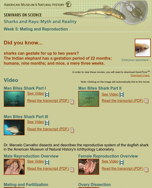 Learn about the reproductive system of the dogfish shark through a video gallery. Also read about the myth that sharks must constantly swim or they will die. PDF transcripts are available for each video.