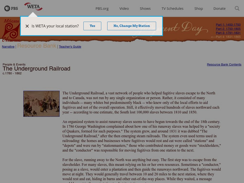 This PBS site provides a general history of the Underground Railroad, including a focus on notable participants or "conductors." Click on Teacher's Guide for teacher resources.