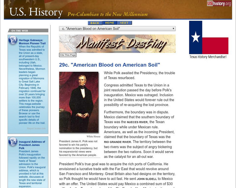 An explanation of the difficulties the Republic of Texas encountered when deciding whether to join the Union. Also discusses President James Polk's efforts to expand the territories held by the United States, which brought him into...