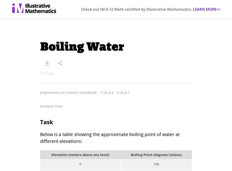 Students are shown two tables of data showing the approximate boiling point of water at different elevations. Both data sets can be modeled by linear functions but with different slopes. When the tables are combined, however, students...