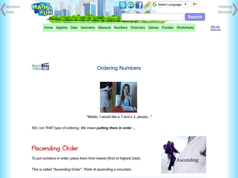 Learners investigate how to order numbers. The educational resource consists of notes about the concept, examples, and learning games.