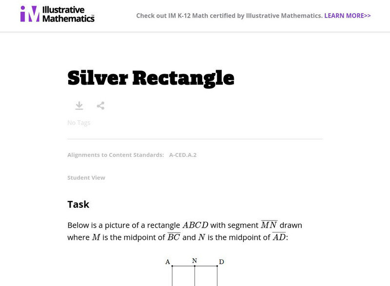 This task provides a geometric context for working with ratios and algebraic equations. Students will create and then solve an algebraic equation describing a remarkable shape, the silver rectangle. Aligns with A-CED.A.2.