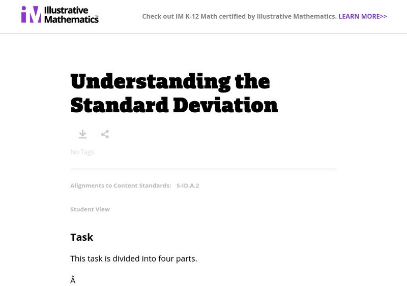 The purpose of this task is to deepen student understanding of the standard deviation as a measure of variability in data distribution. The task is divided into four parts, each of which asks students to think about standard deviation in...