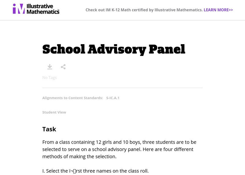 How do you choose the best sampling method for a specific task? This lesson asks the learners to decide the best way out of four choices to select three students to serve on a school advisory panel. Learners need to defend their choice....