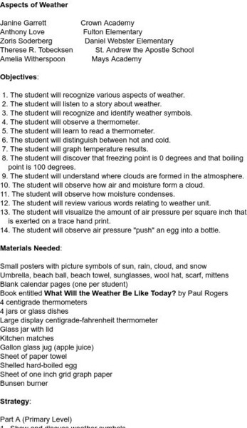 A detailed weather lesson plan written for the primary, intermediate, and junior high level. Topics covered are weather symbols, thermometer, graphing temperature results, clouds, moisture and air pressure.