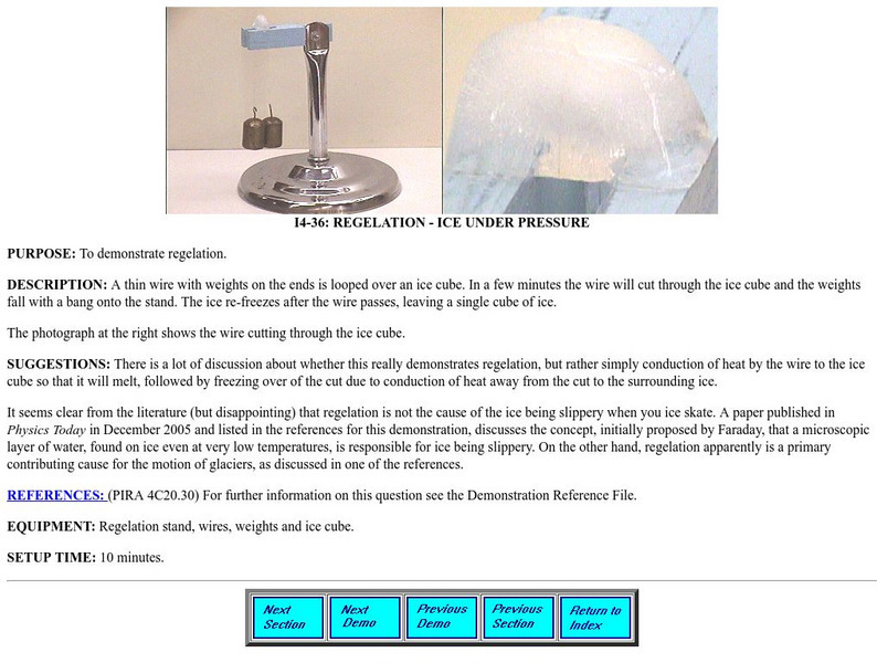 A page from the University of Maryland Physics Lecture Demonstration Facility. Provides directions for a teacher demonstration on the phenomenon of regelation. Shows apparatus and set-up; provides suggestions. Easily adaptable as a...