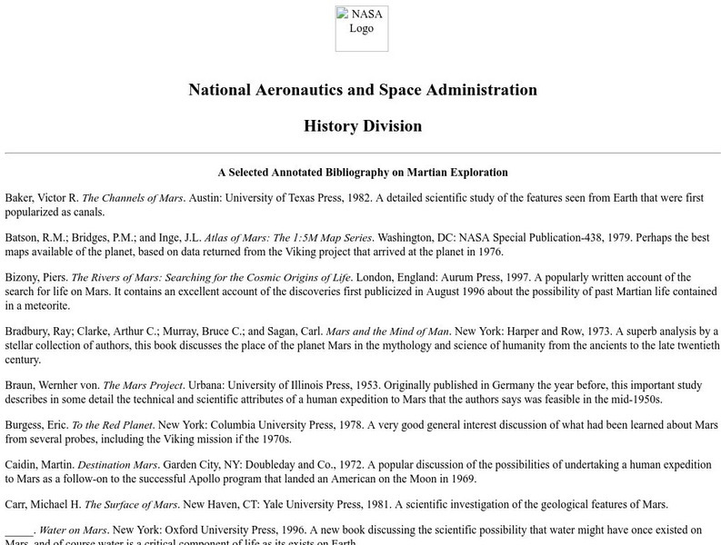 This site from NASA provides a selected Annotated Bibliography on Martian Exploration presents classical Mars reading material from Percival Lowell and Alfred Russel Wallace from the turn of the last century, Werner von Braun and Willy...