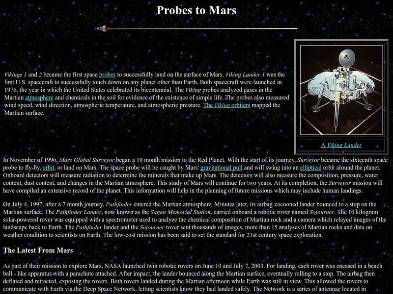 This site has a description of the different probes to pass by and land on Mars. Glossary, graphics, and printable version are also included.