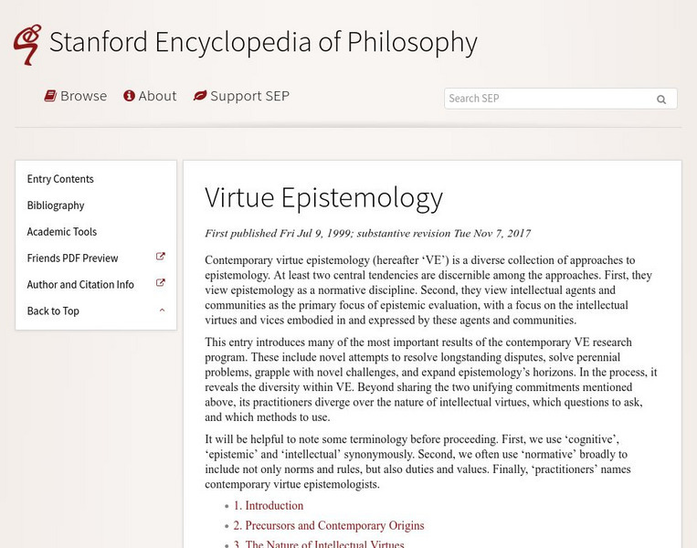 Stanford Encyclopedia of Philosophy: Virtue Epistemology