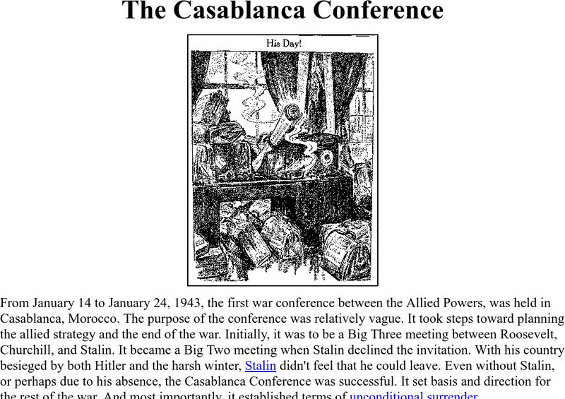 A good description of the Casablanca Conference, its participants, those who were absent, and the accomplishments of the meeting. Hyperlinks to political cartoons reflecting the dealings at the conference.