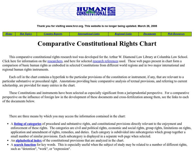 This Comparative Constitutional Rights Chart is very interesting to check out. The rights are broken into categories, and most of the information is accessed through links, along with additional information.