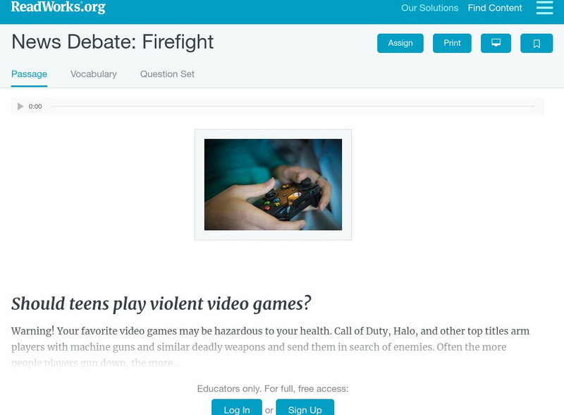 [Free Registration/Login Required] An informational text debating whether teens should or should not be allowed to play violent video games. A question sheet is available to help students build skills in reading comprehension.