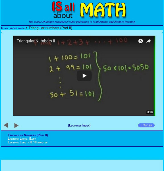 Continuing the podcast from Triangular Numbers (Part I), the Gaussian formula for summing numbers of an arithmetic sequence is derived with good explanation, and then used for a couple examples.