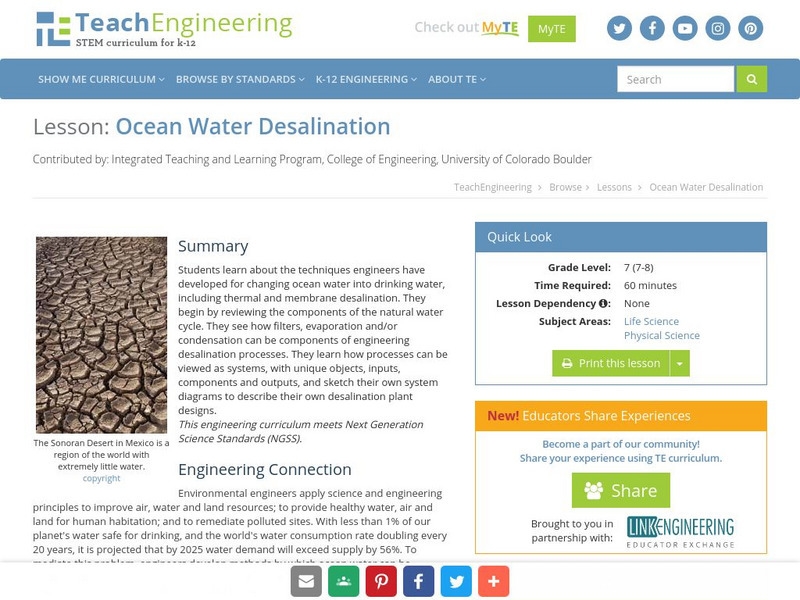 Students learn about the techniques engineers have developed for changing ocean water into drinking water, including thermal and membrane desalination. They begin by reviewing the components of the natural water cycle. They see how...