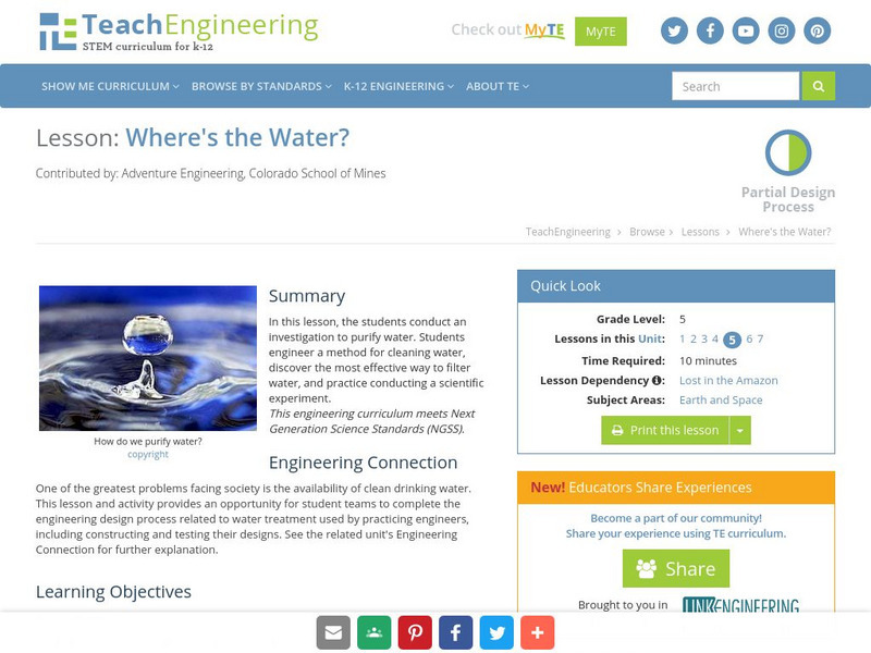 Students learn about global access to clean water and apply the engineering design process to develop a solution to purify water.