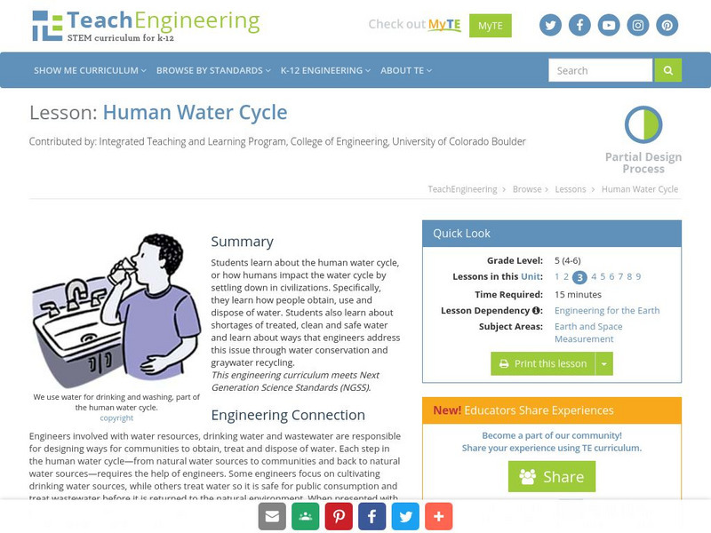 Students learn about the human water cycle, or how humans impact the water cycle by settling down in civilizations. Specifically, they learn how people obtain, use and dispose of water. Students also learn about shortages of treated,...