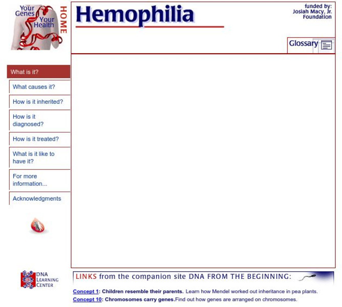 An excellent site that investigates the causes and treatments of Hemophilia, as well as the symptoms and much more.
