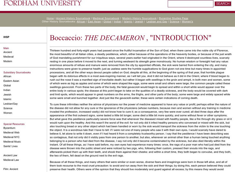 Fordham University provides a translation of "The Decameron". This is a widely read personal account written at the time of the plague.