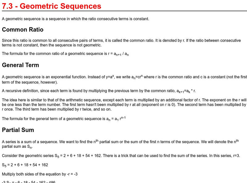 Richland Community College provides a lesson on geometric sequences. This site has explanations and examples of their properties.