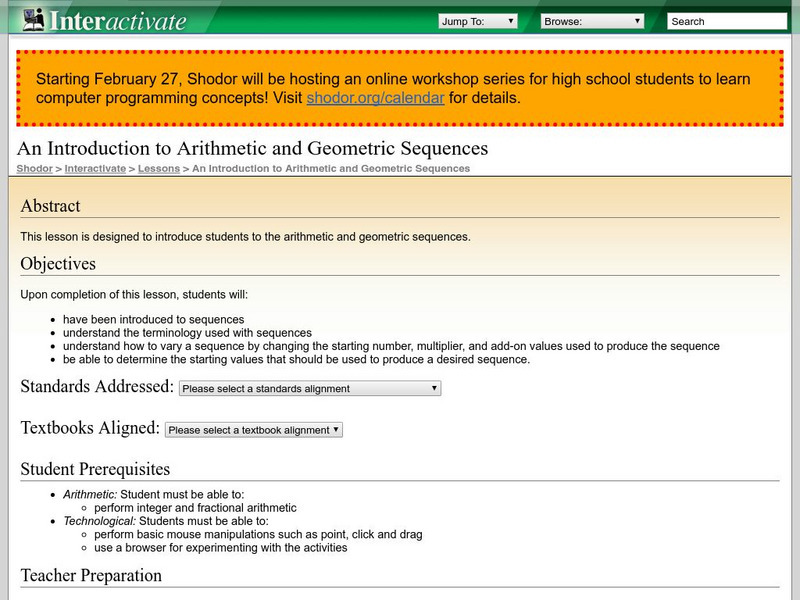 Shodor Interactivate: Lesson: Introduction to Arithmetic and Geometric Sequence