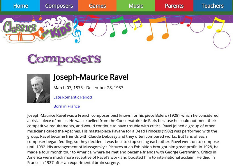 Classics For Kids provides a short biography of Late Romantic composer Joseph-Maurice Ravel, born on March 7, 1875.