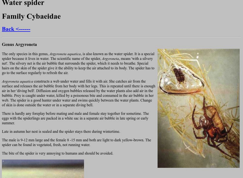 A resource with information on the water spider. Contains pictures and information on the way the spider stays alive and how it feeds.