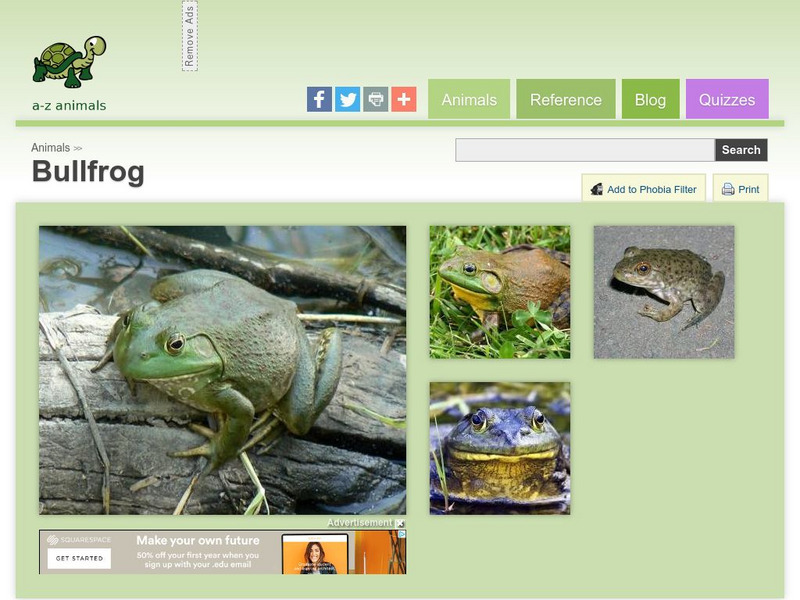 National Geographic site engages users with colorful photos and extensive facts about American Bullfrogs. Be sure to click on the video link to view a short clip on these fascinating animals.