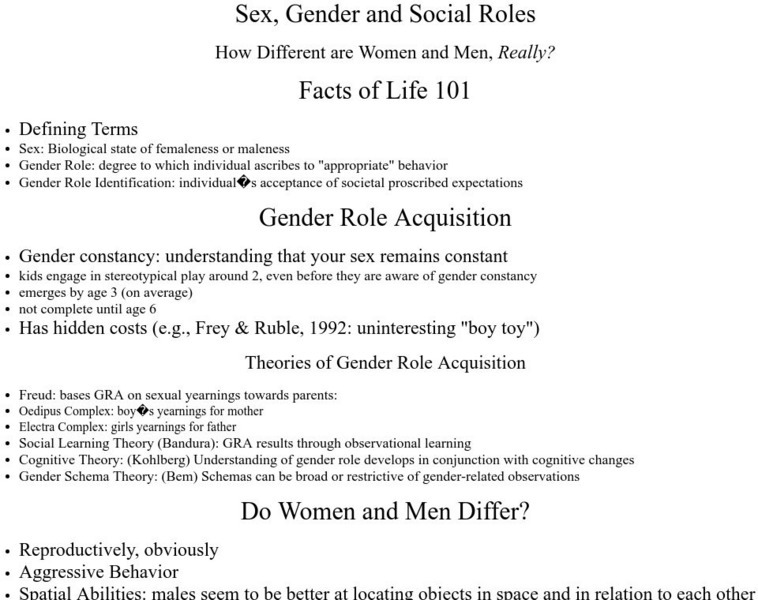 College lecture notes. Discusses gender and social roles. Sections include: Gender Role Acquisition, Theories of Gender Role Acquisition, Do Women and Men Differ?, Making Sense of it all.