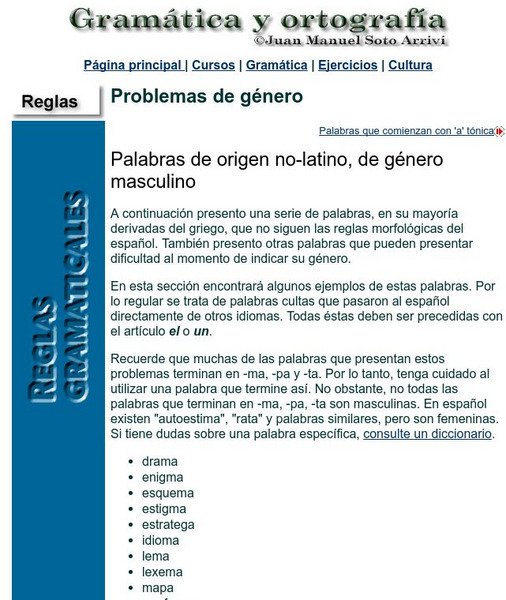 This site from the Indiana University provides a concise, but thorough, Spanish explanation of nouns that do not follow the normal rules for gender. Greek and latin influence is examined. Great review for advanced students or teachers...