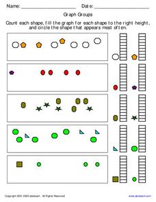 In this mathematics worksheet, students solve a number of problems by counting each shape and graphing the amount to the right in height. Then they circle the shape that appears the most often on the sheet.