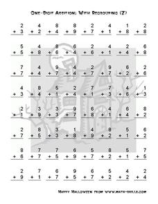 For this Halloween-themed single digit addition worksheet, students solve 64 problems that require them to add single digit numbers with regrouping.