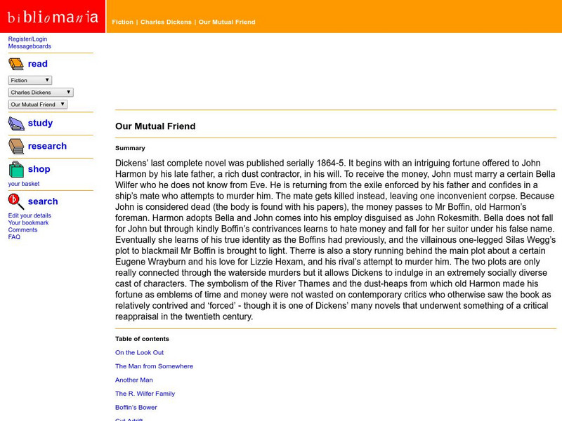 This Bibliomania website provides the full text of Dickens's last complete novel Our Mutual Friend. A brief summary of the novel is also included.