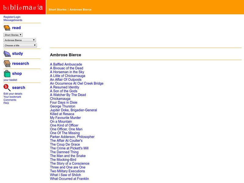 This Bibliomania site provides the full text to over 25 short stories by Ambrose Bierce! Each story is accessible by just clicking on the link of the one that you want to read. A great site to check out on the subject.