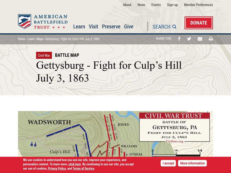 Battlefield map of the Battle of Gettysburg depicts troop movement of the Union and Confederate Armies in the fight for Culps Hill on July 3, 1863.
