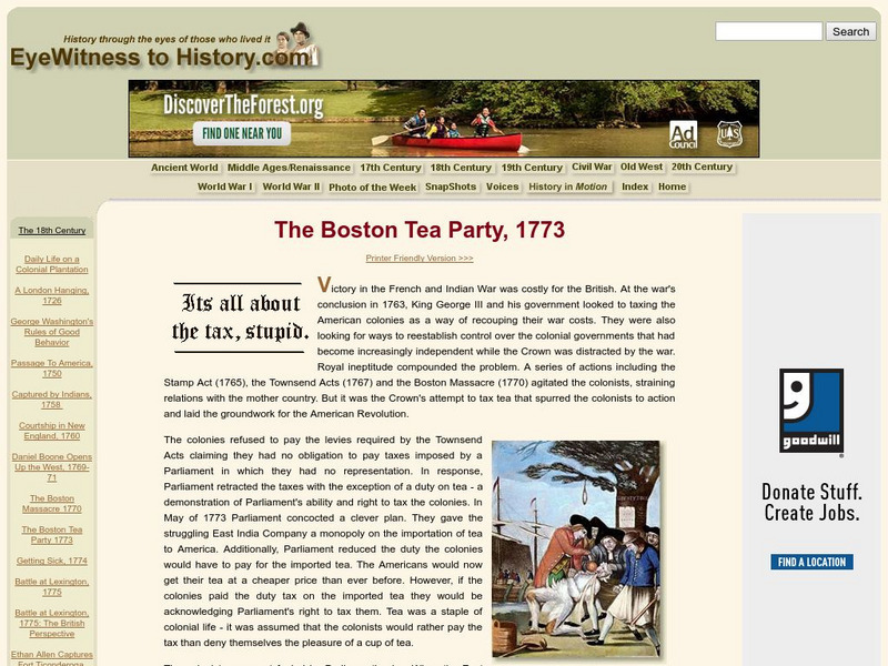 This short TED talk given by Ben Labaree gives the background of the Boston Tea Party and its eventual ramifications. [3:48]