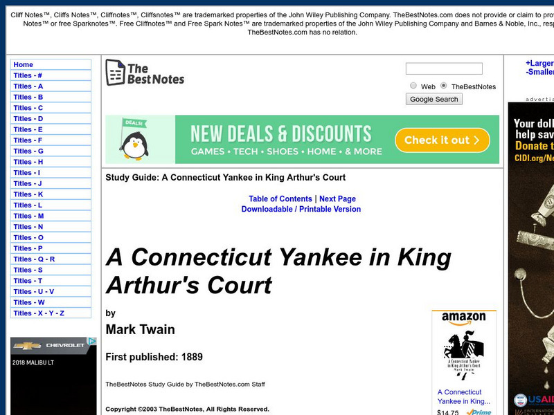 This is an online study guide for the novel A Connecticut Yankee in King Arthur's Court by Mark Twain including author information, literary elements, chapter-by-chapter summaries/notes, study questions, and analysis.