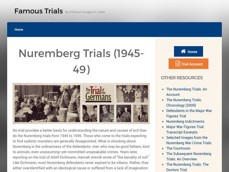 A large selection of primary source documents, pictures, biographical sketches and much more about the famous war crimes trials held over a period of several years in Nuremberg after World War 2.