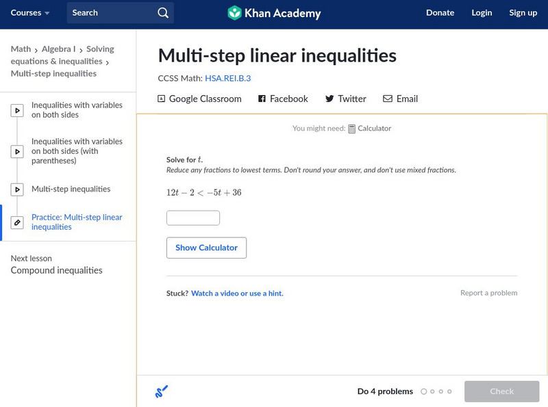 Solve linear inequalities that take multiple steps to solve. Students receive immediate feedback and have the opportunity to try questions repeatedly, watch a video, or receive hints.