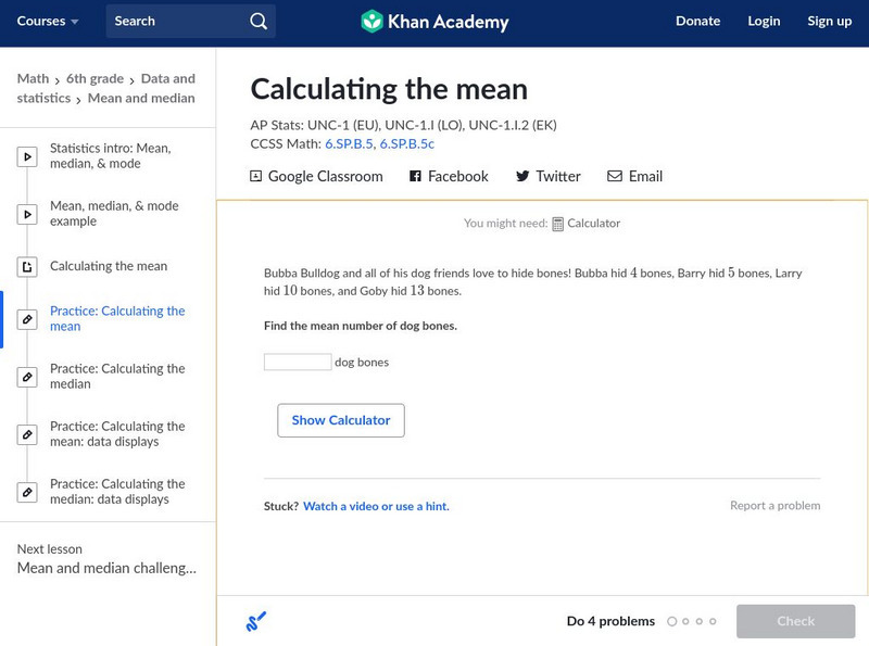 Practice calculating the mean (average) of a data set. The mean gives us a sense of the middle, or center, of the data. Students receive immediate feedback and have the opportunity to try questions repeatedly, watch a video or receive...
