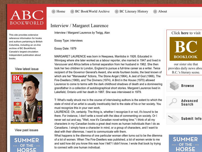 Bc Bookworld: Interview With Margaret Laurence by Alan Twigg