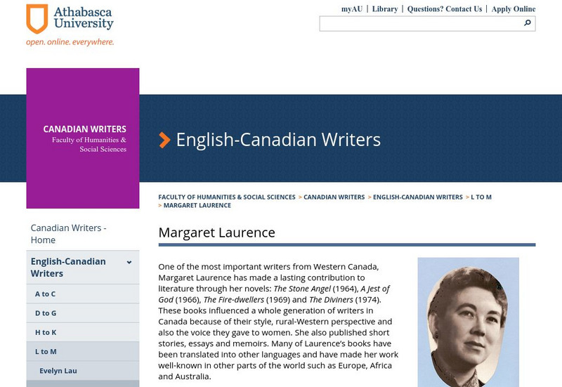 Read about "one of the most important writers from Western Canada, Margaret Laurence." Here is information on her early life, education, published works, and received honours.