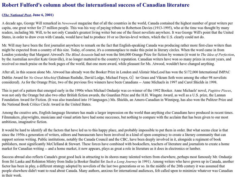 Robert Fulford: The International Success of Canadian Literature