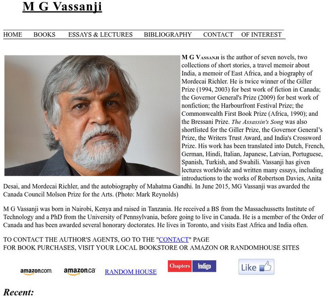 Explore Canadian author M.G. Vassanji's own website where he has posted biographical information, insight on his books, and a list of articles analyzing his work. Vassanji is a two-time Giller Prize winner.