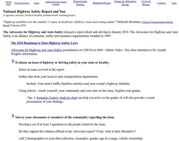 Look over resources with car accident reports, highway safety data, etc. Students will evaluate a local issue of road safety and build a report based on the researched data.