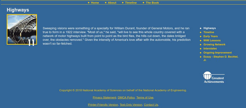 Students learn about highways in the 20th century. Some topics investigated are WWI lessons, interstates, and ongoing improvements. The resource consists of historical information, a timeline, and a personal essay by a key innovator.