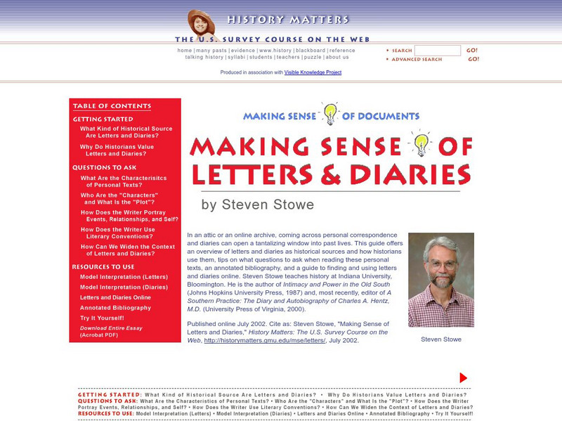 "Making Sense of of Letters & Diaries," explores the historical importance of various types of "personal texts." Learn the general characteristics of personal texts and read various online diaries and letters of historical...