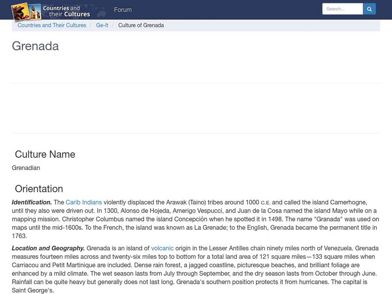 Provides an overview of the culture of Grenada. Gives basic information on topics such as geography, ethnic makeup, languages, symbolism, economy, food, customs, social stratification, family life, education, religion, politics, etc....